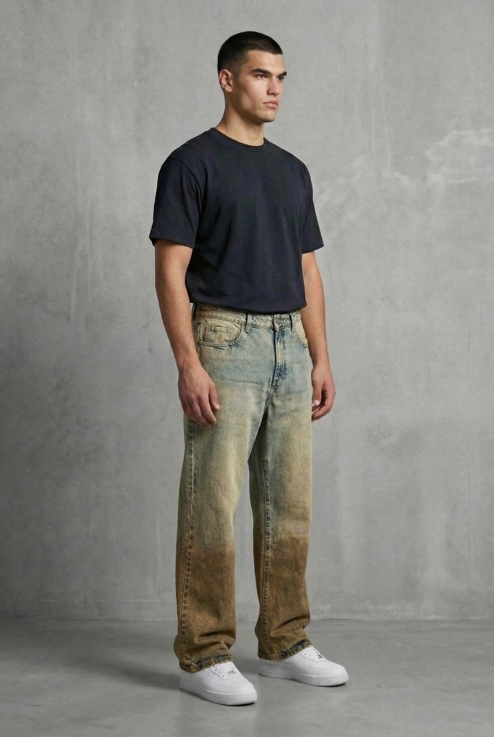 Caratterizzati da un'estetica audace e sperimentale, questi jeans combinano un lavaggio acido grigio-bluastro con una marcata sfumatura color ruggine sulla parte inferiore. È il capo definitivo per chi vuole un look industriale, perfetto per distinguersi nella giungla urbana.